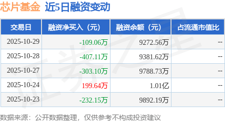 证券之星消息,10月29日,芯片基金(159801)融资买入1834.63万元,融资偿还1943.69万元,融资净卖出109.06万元,融资余额9272.56万元,近20个交易日中有12个交易日出现融资净买入。