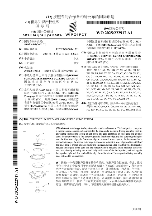 证券之星消息,根据企查查数据显示上声电子(688533)公布了一项国际专利申请,专利名为“薄型扬声器及车载音响系统”,专利申请号为PCT/CN2024/141291,国际公布日为2025年10月30日。