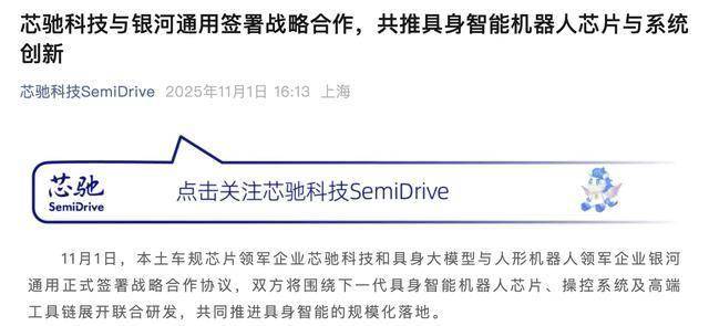 瑞财经 吴文婷11月1日,芯驰科技与银河通用正式签署战略合作协议,双方将围绕下一代具身智能机器人芯片、操控系统及高端工具链展开联合研发,共同推进具身智能的规模化落地。