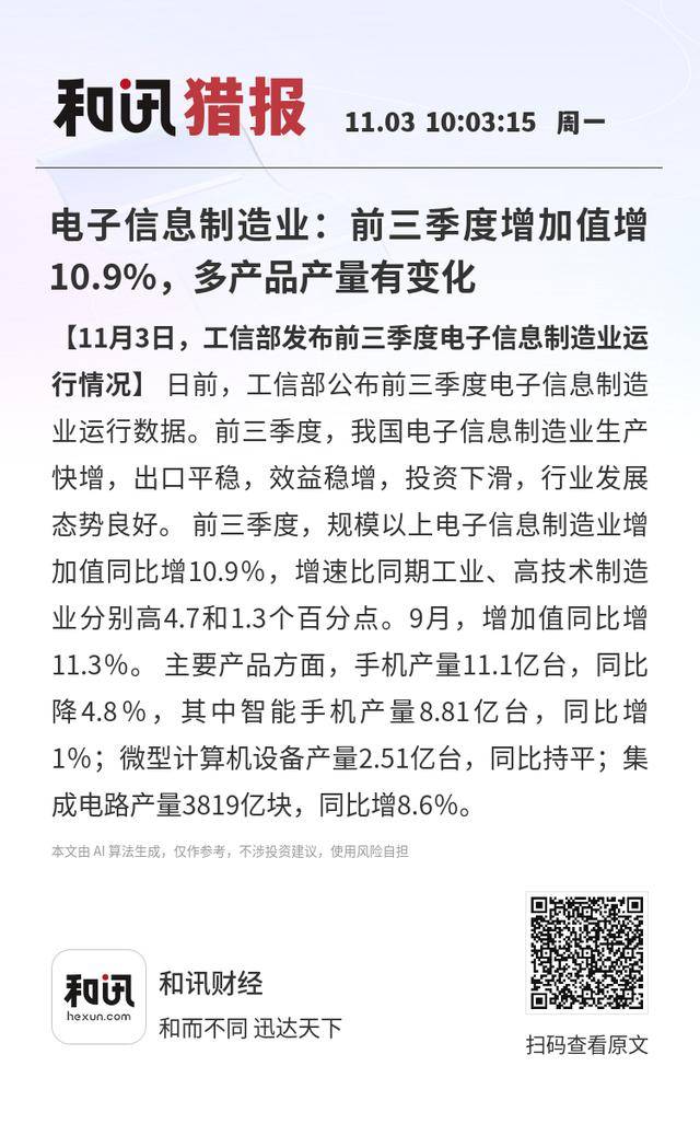 【11月3日,工信部发布前三季度电子信息制造业运行情况】日前,工信部公布前三季度电子信息制造业运行数据。前三季度,我国电子信息制造业生产快增,出口平稳,效益稳增,投资下滑,行业发展态势良好。 前三季度,规模以上电子信息制造业增加值同比增10.9%,增速比同期工业、高技术制造业分别高4.7和1.3个百分点。9月,增加值同比增11.3%。 主要产品方面,手机产量11.1亿台,同比降4.8%,其中智能手机产量8.81亿台,同比增1%;微型计算机设备产量2.51亿台,同比持平;集成电路产量3819亿块,同比增8.6%。