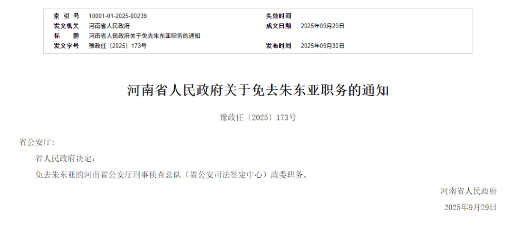 9月29日,河南省人民政府发布人事任免通知,其中:免去朱东亚的河南省公安厅刑事侦查总队(省公安司法鉴定中心)政委职务。