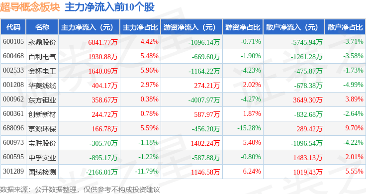 从资金流向上来看,当日超导概念板块主力资金净流出5.28亿元,游资资金净流入4656.77万元,散户资金净流入4.82亿元。超导概念板块个股资金流向见下表: