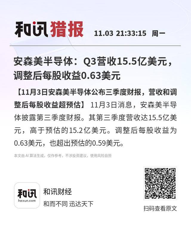 【11月3日安森美半导体公布三季度财报,营收和调整后每股收益超预估】11月3日消息,安森美半导体披露第三季度财报。其第三季度营收达15.5亿美元,高于预估的15.2亿美元。调整后每股收益为0.63美元,也超出预估的0.59美元。