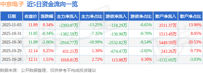 11月3日的资金流向数据方面,主力资金净流出2393.07万元,占总成交额13.25%,游资资金净流出118.29万元,占总成交额0.65%,散户资金净流入2511.37万元,占总成交额13.9%。