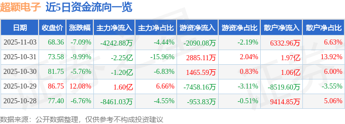 证券之星消息,截至2025年11月3日收盘,超颖电子(603175)报收于68.36元,下跌7.09%,换手率31.76%,成交量13.97万手,成交额9.56亿元。