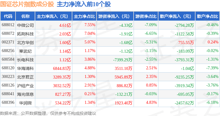 资金流向方面,国证芯片(980017)指数成份股当日主力资金净流出合计15.59亿元,游资资金净流入合计1.16亿元,散户资金净流入合计14.43亿元。成份股资金流向详情见下表: