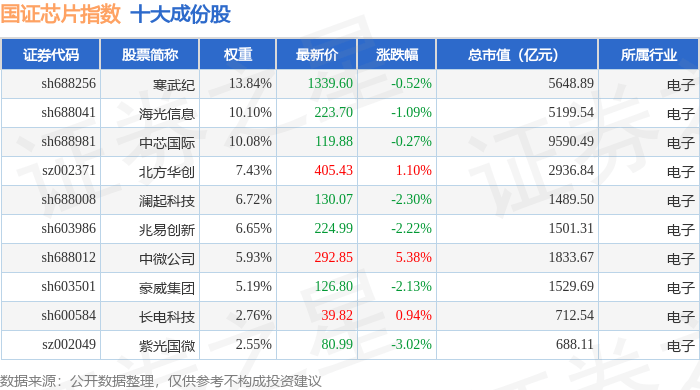证券之星消息,11月4日,国证芯片(980017)指数报收于12775.0点,跌0.51%,成交720.79亿元,换手率2.27%。当日该指数成份股中,上涨的有9家,中微公司以5.38%的涨幅领涨,下跌的有21家,紫光国微以3.02%的跌幅领跌。