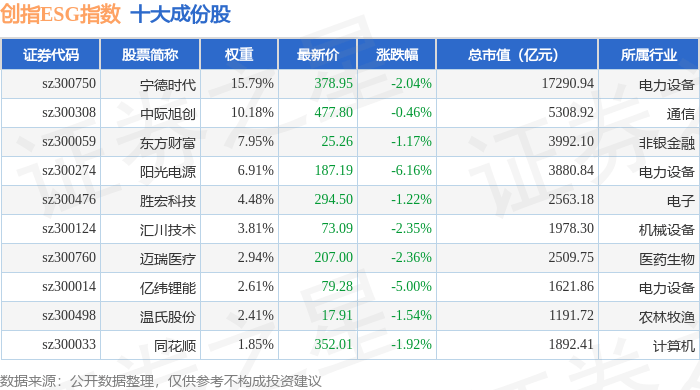 证券之星消息,11月4日,创指ESG(970028)指数报收于3256.83点,跌2.12%,成交1395.73亿元,换手率2.62%。当日该指数成份股中,上涨的有10家,蓝色光标以3.69%的涨幅领涨,下跌的有70家,阳光电源以6.16%的跌幅领跌。