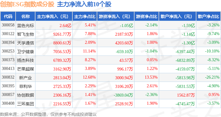 资金流向方面,创指ESG(970028)指数成份股当日主力资金净流出合计112.09亿元,游资资金净流入合计38.24亿元,散户资金净流入合计73.84亿元。成份股资金流向详情见下表: