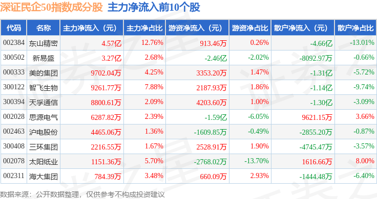 资金流向方面,深证民企50(970057)指数成份股当日主力资金净流出合计108.11亿元,游资资金净流入合计27.78亿元,散户资金净流入合计80.33亿元。成份股资金流向详情见下表: