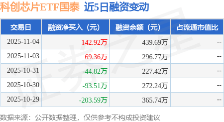 证券之星消息,11月4日,科创芯片ETF国泰(589100)融资买入253.73万元,融资偿还110.81万元,融资净买入142.92万元,融资余额439.69万元。