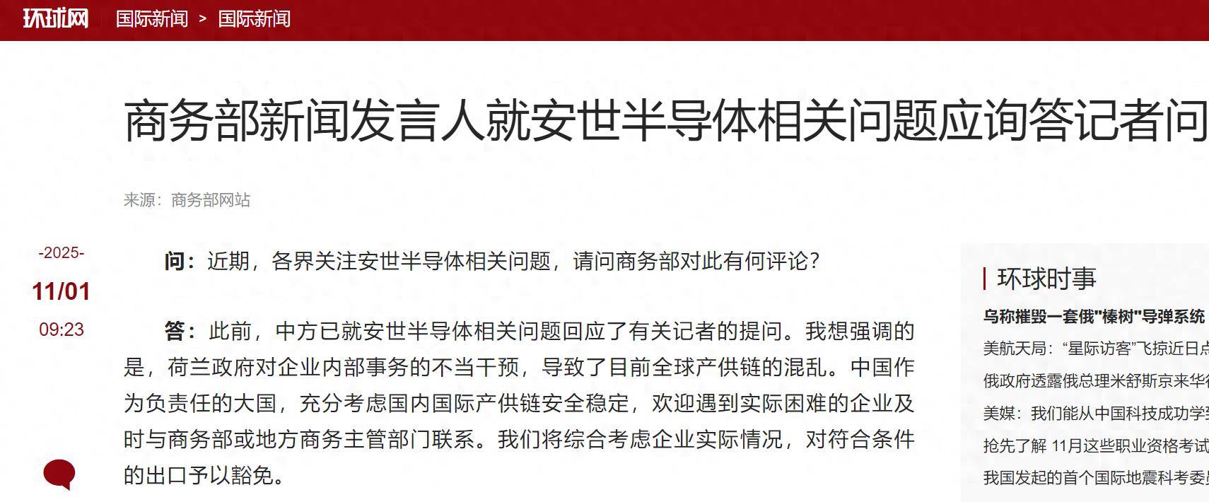 就在商务部表态的前一天,中企亮明了底线,将安世半导体恢复中国籍CEO、消除“窃取技术”的不实指控,和拿回对安世半导体的完整控制权,作为重启芯片出口的条件。