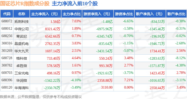 资金流向方面,国证芯片R(480017)指数成份股当日主力资金净流出合计16.41亿元,游资资金净流入合计3470.02万元,散户资金净流入合计16.07亿元。成份股资金流向详情见下表: