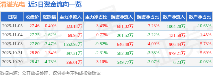 证券之星消息,截至2025年11月5日收盘,清溢光电(688138)报收于27.46元,上涨0.4%,换手率1.1%,成交量3.45万手,成交额9425.03万元。