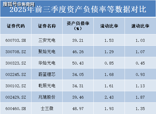流动比率方面,兆驰股份以2.43的优异表现领先行业,士兰微以1.93位列第二,显示出较强的短期偿债能力。蔚蓝锂芯、乾照光电和三安光电的流动比率分别为1.68、1.61和1.53,均高于1.5的行业安全水平。