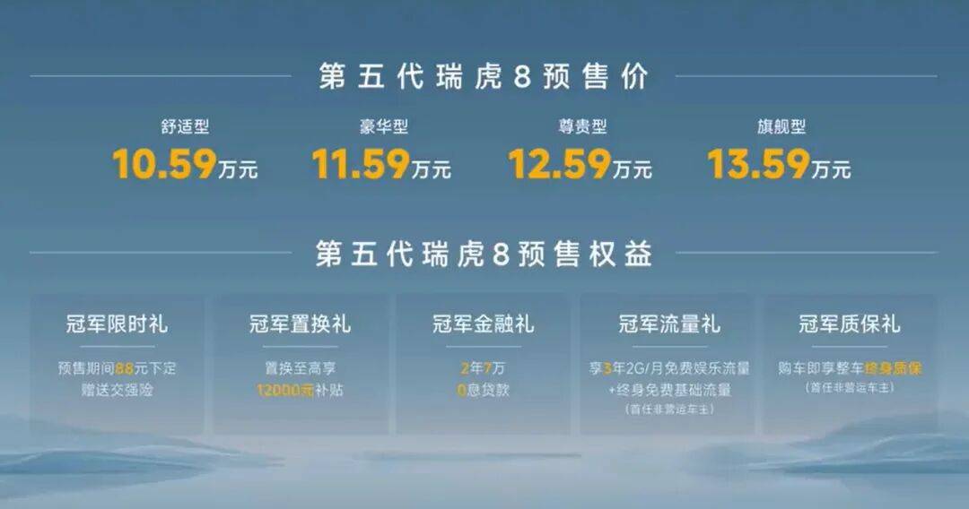 第五代瑞虎8的推出,并非简单换代,而是一次针对用户真实需求的“精准升级”。它未盲目追随电动化,而是在燃油车优势基础上,补齐智能、安全与豪华体验的短板,为信赖燃油技术、同时追求电感体验的用户,提供了“鱼与熊掌可以兼得”的理想选择。以10.59万元起的预售价,它不仅刷新了家庭SUV的价值标准,更展示了“新燃油”车型在智能时代的顽强生命力。