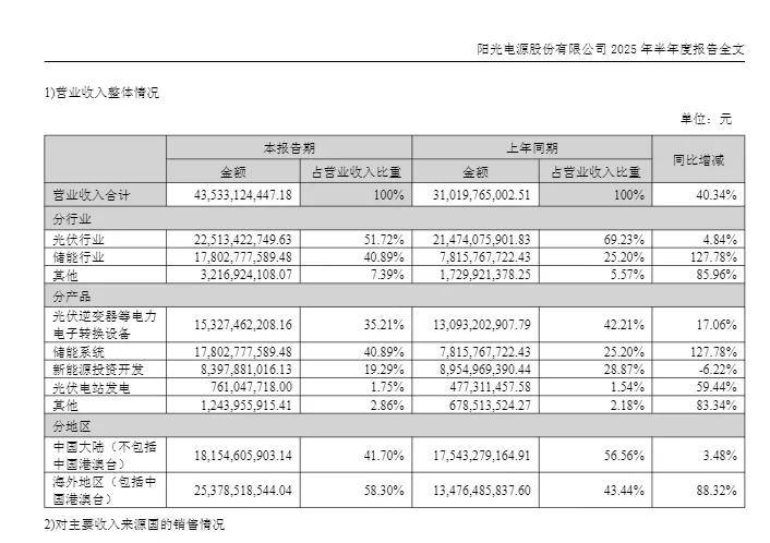 而进一步使得阳光电源脱离国内光伏行业满目疮痍的惨状的关键在于,公司主营市场在海外。2025 年1-6月海外收入254亿元,占比58.4%,较 2022 年的 47.5% 大幅提升。2024年数据显示,其海外业务毛利率41.6%,是国内业务的近两倍。