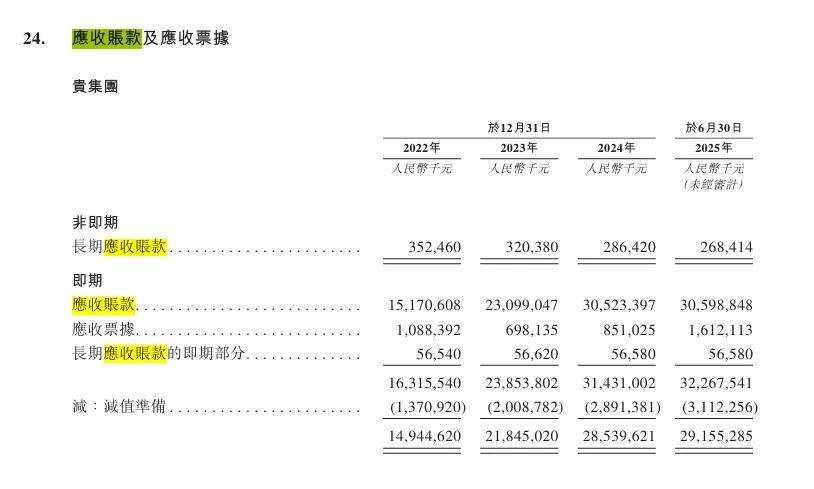2022年至2025年上半年,公司的应收账款及应收票据总额分别为152.97亿元、221.65亿元、288.26亿元及294.23亿元;对此,公司分别作出减值准备13.71亿元、20.09亿元、28.91亿元及31.12亿元。