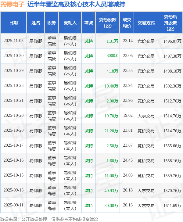民德电子近半年内的董监高及核心技术人员增减持详情如下: