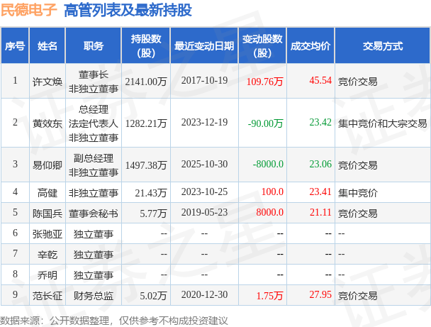 民德电子的高管列表及最新持股情况如下: