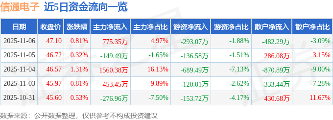 证券之星消息,截至2025年11月6日收盘,信通电子(001388)报收于47.1元,上涨0.81%,换手率10.66%,成交量3.26万手,成交额1.56亿元。