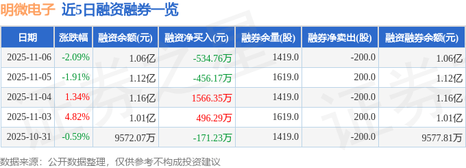 明微电子融资融券信息显示,融资方面,当日融资买入812.79万元,融资偿还1347.56万元,融资净偿还534.76万元。融券方面,融券卖出0.0股,融券偿还200.0股,融券余量1419.0股,融券余额5.86万元。融资融券余额1.06亿元。