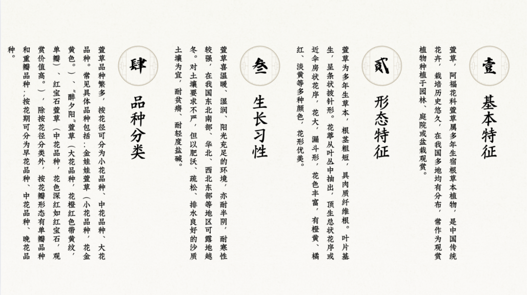 萱草的文化意象始于《诗经・卫风・伯兮》,诗中写道“焉得谖草,言树之背”,朱熹注曰:“谖草,令人忘忧;背,北堂也。”“谖草”即萱草,北堂为母亲居所,萱草自此与母爱、解忧紧密相连。汉代《说文解字》释“萱”为“令人忘忧草”,西晋《博物志》进一步记载:“萱草,食之令人好欢乐,忘忧思,故曰忘忧草。”奠定了其“疗愈心灵”的文化基调。