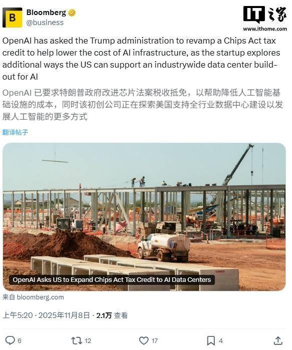 IT之家 11 月 8 日消息,彭博社今日报道称,OpenAI 致函美国白宫科学与技术政策办公室(OSTP),呼吁政府扩大《芯片与科学法案》(Chips Act)下的税收抵免范围,将原本面向半导体制造业的 35% 税收抵免延伸至人工智能数据中心、AI 服务器生产商及相关电力基础设施领域。