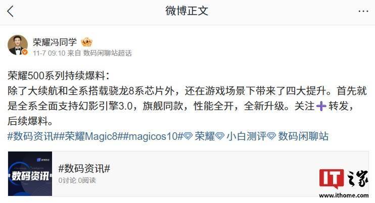 IT之家 11 月 9 日消息,荣耀游戏研发工程师 @荣耀冯同学 在 11 月 7 日发布了数字 500 系列手机“爆料”,称新机除了大续航和全系搭载骁龙 8 系芯片外,还在游戏场景下带来了四大提升。首先就是全系全面支持幻影引擎 3.0,旗舰同款。