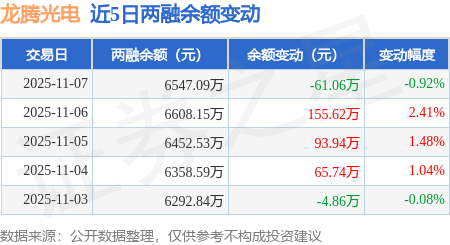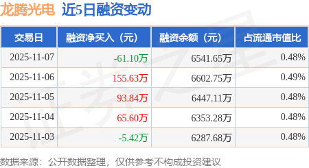 证券之星消息,11月7日,龙腾光电(688055)融资买入191.27万元,融资偿还252.36万元,融资净卖出61.1万元,融资余额6541.65万元,近20个交易日中有11个交易日出现融资净买入。