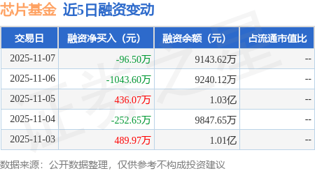 证券之星消息,11月7日,芯片基金(159801)融资买入857.88万元,融资偿还954.38万元,融资净卖出96.5万元,融资余额9143.62万元。