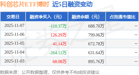 证券之星消息,11月7日,科创芯片ETF博时(588990)融资买入227.51万元,融资偿还337.88万元,融资净卖出110.37万元,融资余额688.7万元。