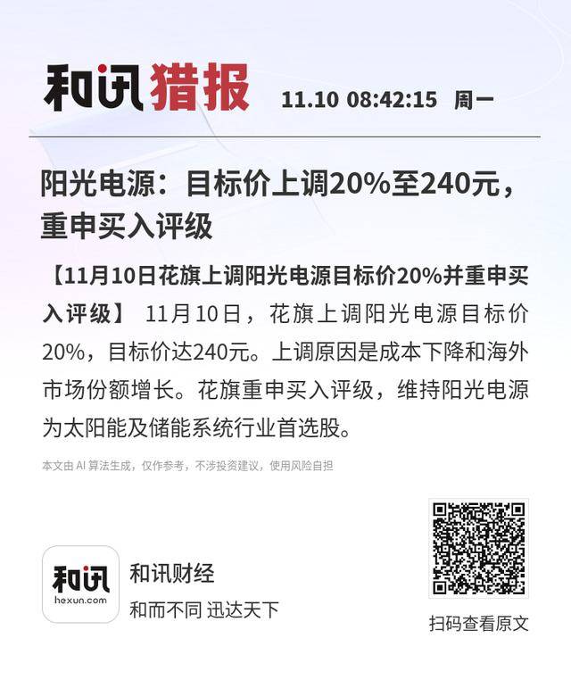 【11月10日花旗上调阳光电源目标价20%并重申买入评级】11月10日,花旗上调阳光电源目标价20%,目标价达240元。上调原因是成本下降和海外市场份额增长。花旗重申买入评级,维持阳光电源为太阳能及储能系统行业首选股。