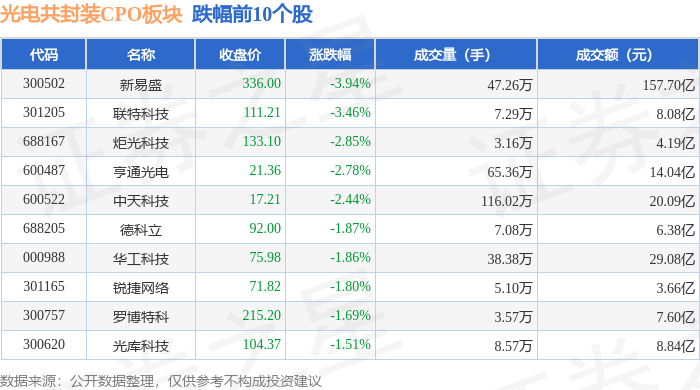 证券之星消息,11月10日光电共封装CPO板块较上一交易日下跌0.36%,新易盛领跌。当日上证指数报收于4018.6,上涨0.53%。深证成指报收于13427.61,上涨0.18%。光电共封装CPO板块个股涨跌见下表: