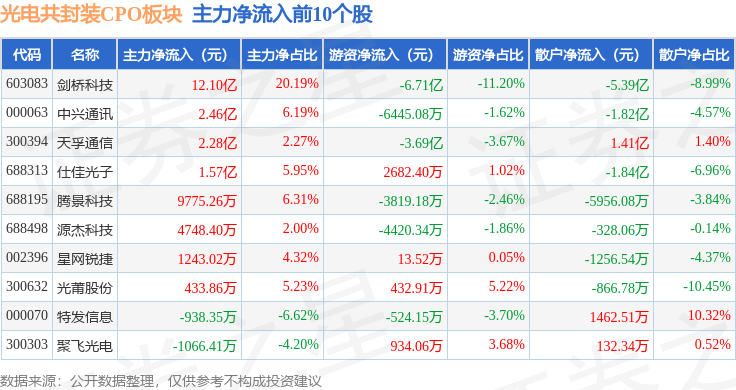 从资金流向上来看,当日光电共封装CPO板块主力资金净流出21.81亿元,游资资金净流入4.78亿元,散户资金净流入17.03亿元。光电共封装CPO板块个股资金流向见下表: