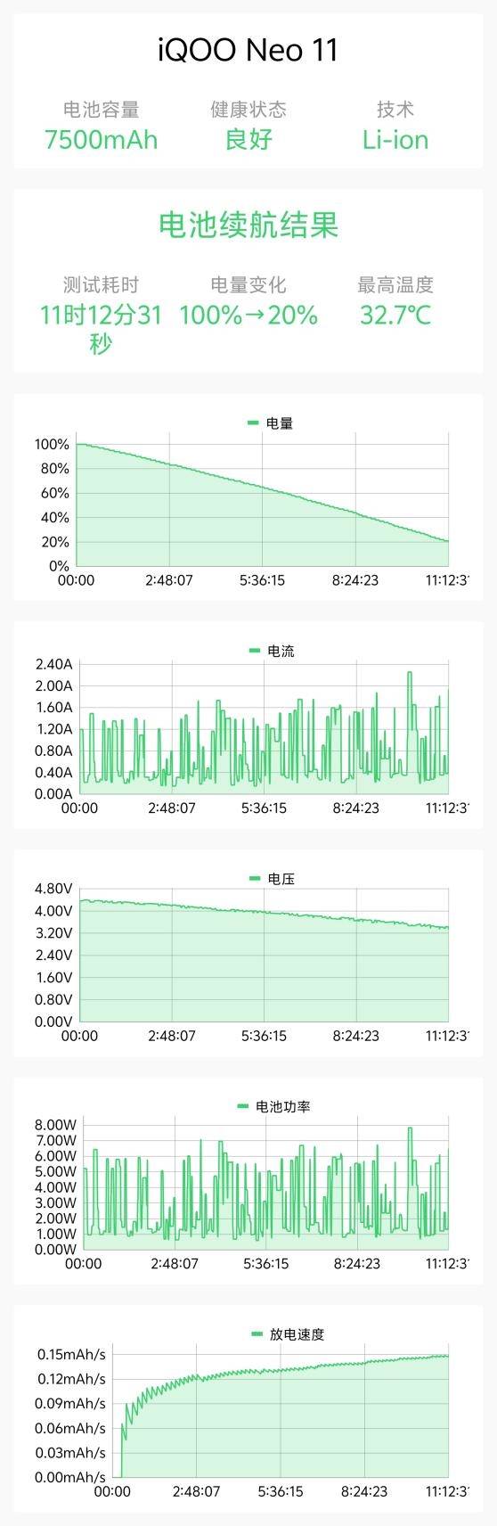 iQOO Neo11在电池狗狗中的续航测试坚持了11小时12分钟,估算总续航可达14小时。