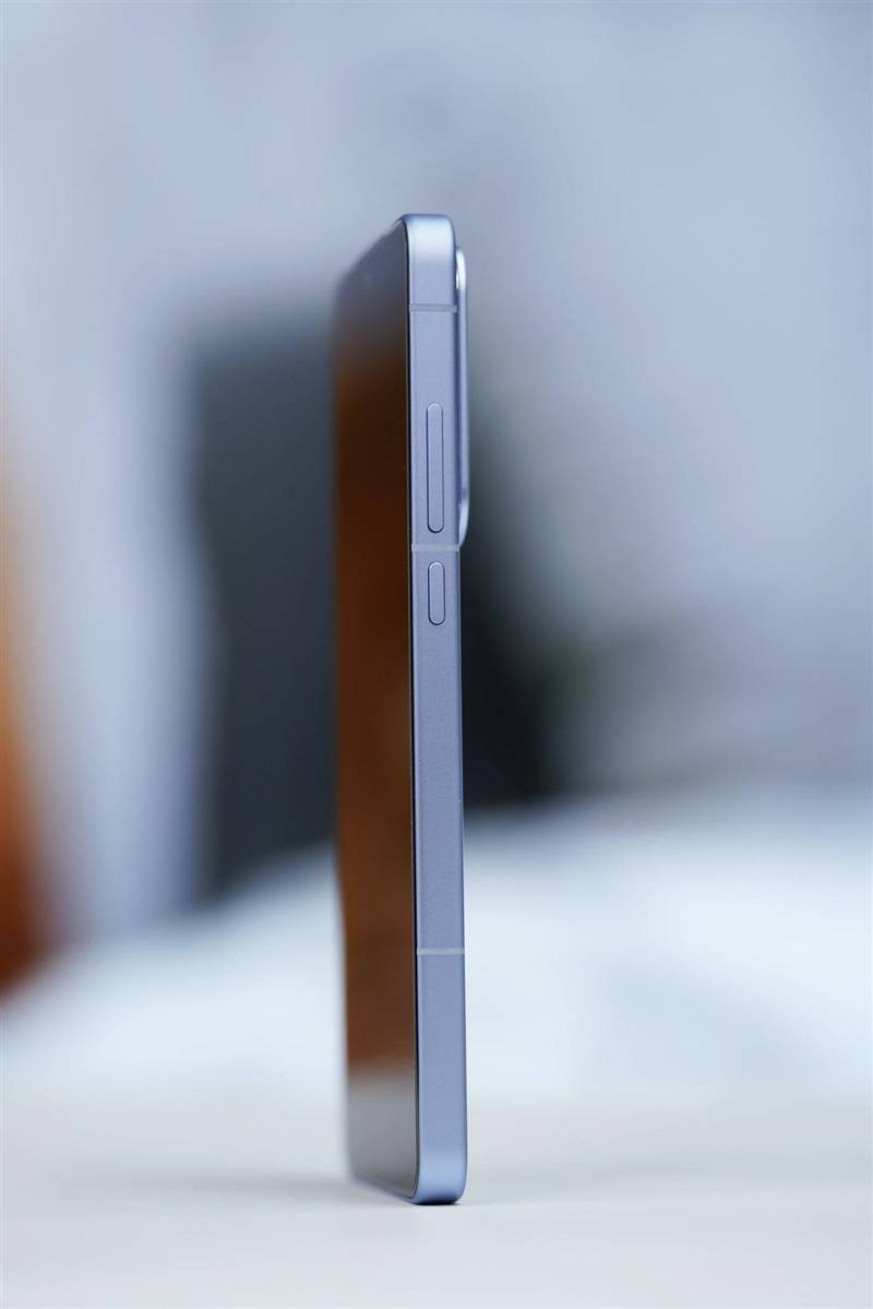 电源键与音量键位于右侧中框,“面对疾风”配色的厚度为8.13mm,电源键距手机底部约9.4cm。
