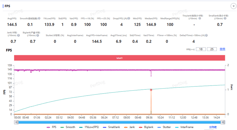 在一局5v5天梯回放赛当中,平均游戏帧数达到了144.5FPS,稳帧指数0.1,1%low帧都有133.9FPS,比其他120帧机型的平均帧数还要高。