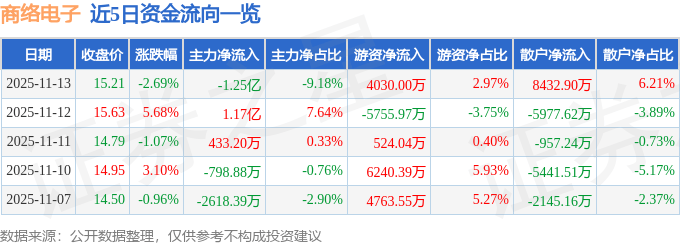 证券之星消息,截至2025年11月13日收盘,商络电子(300975)报收于15.21元,下跌2.69%,换手率17.81%,成交量87.64万手,成交额13.58亿元。