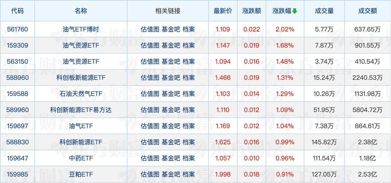 ETF涨跌幅方面,油气资源相关ETF集体走强,最大涨幅为2.02%。