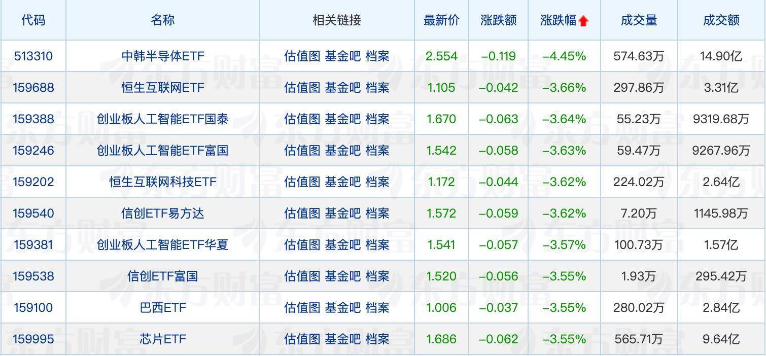 下跌方面,中韩半导体ETF领跌4.45%。算力硬件方向集体回调,存储芯片概念重挫,多只创业板人工智能ETF、信创ETF跌幅居前。