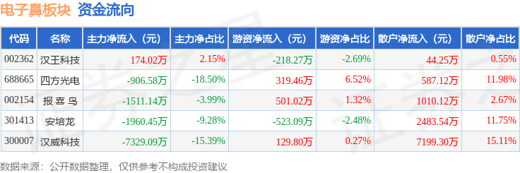 从资金流向上来看,当日电子鼻板块主力资金净流出1.15亿元,游资资金净流入208.92万元,散户资金净流入1.13亿元。电子鼻板块个股资金流向见下表: