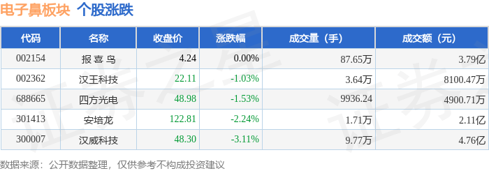 证券之星消息,11月14日电子鼻板块较上一交易日下跌2.01%,汉威科技领跌。当日上证指数报收于3990.49,下跌0.97%。深证成指报收于13216.03,下跌1.93%。电子鼻板块个股涨跌见下表: