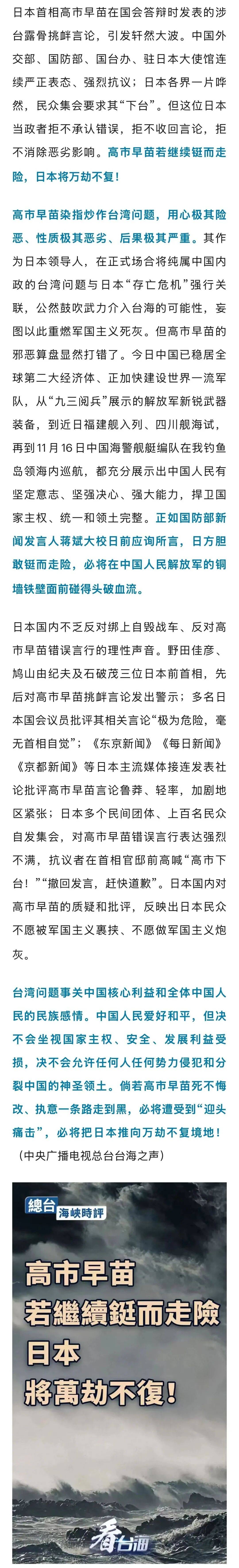 中央广播电视总台11月16日刊发海峡时评《高市早苗若继续铤而走险,日本将万劫不复!》: