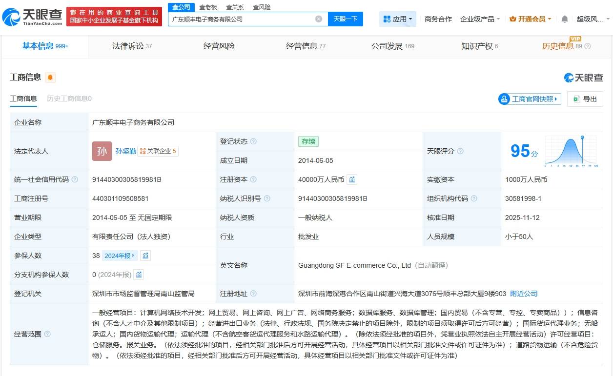 天眼查App显示,近日,广东顺丰电子商务有限公司发生工商变更,注册资本由1000万人民币增至4亿人民币,增幅3900%。