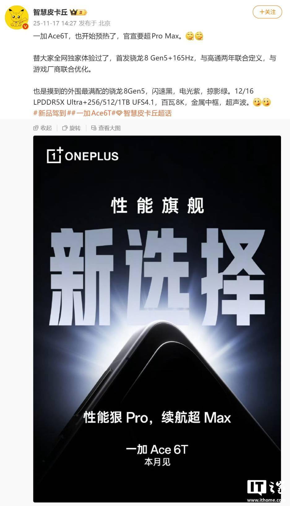 IT之家 11 月 17 日消息,博主 @智慧皮卡丘 今天在微博发文,透露一加 Ace 6T 手机的详细参数。