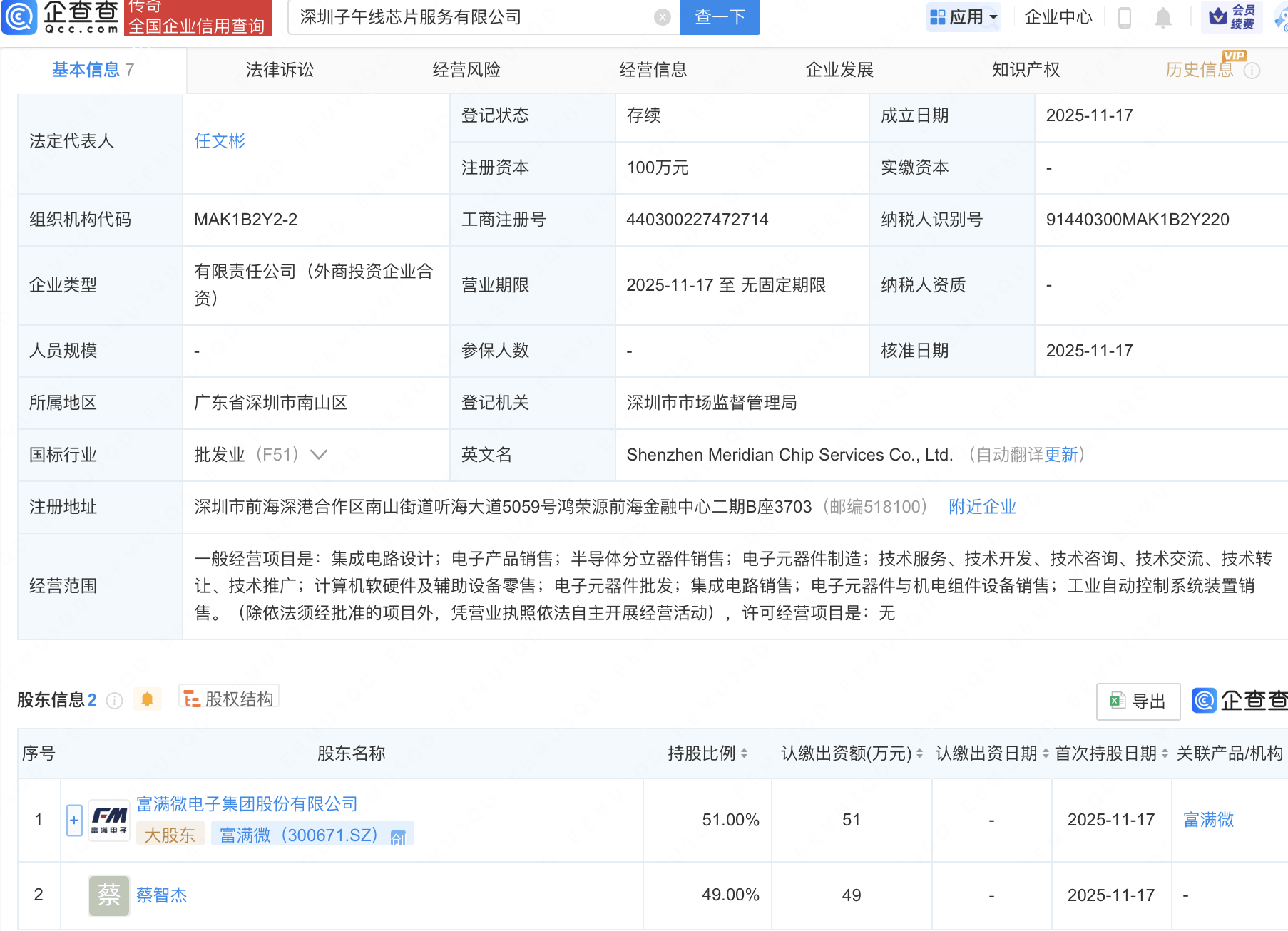 企查查APP显示,近日,深圳子午线芯片服务有限公司成立,经营范围包含:集成电路设计;电子产品销售;半导体分立器件销售;电子元器件制造等。企查查股权穿透显示,该公司由富满微(300671)等共同持股。