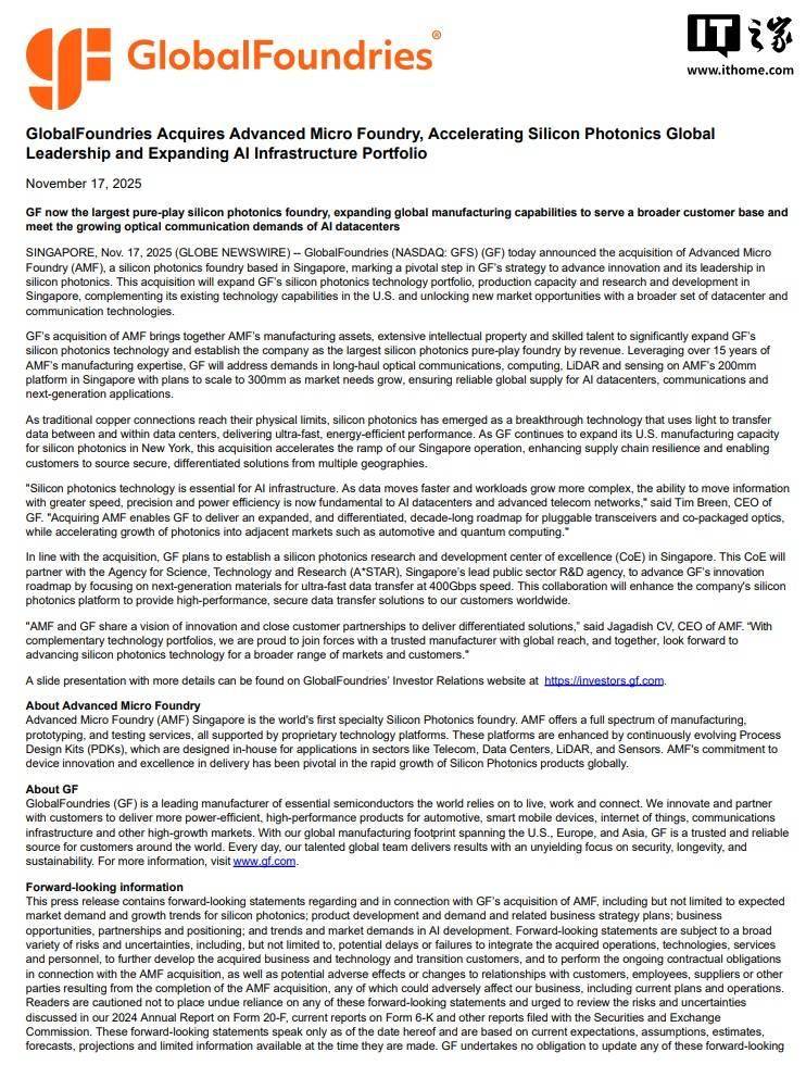 IT之家 11 月 18 日消息,当地时间周一,格芯(GlobalFoundries)宣布已收购总部位于新加坡的硅光子芯片制造商 Advanced Micro Foundry(AMF),详细金额未披露。
