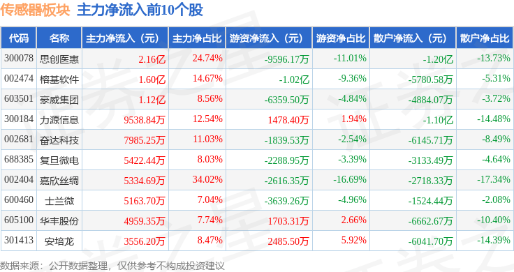 从资金流向上来看,当日传感器板块主力资金净流出18.65亿元,游资资金净流入4.47亿元,散户资金净流入14.19亿元。传感器板块个股资金流向见下表: