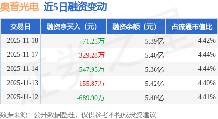 证券之星消息,11月18日,奥普光电(002338)融资买入1783.27万元,融资偿还1854.52万元,融资净卖出71.25万元,融资余额5.39亿元。